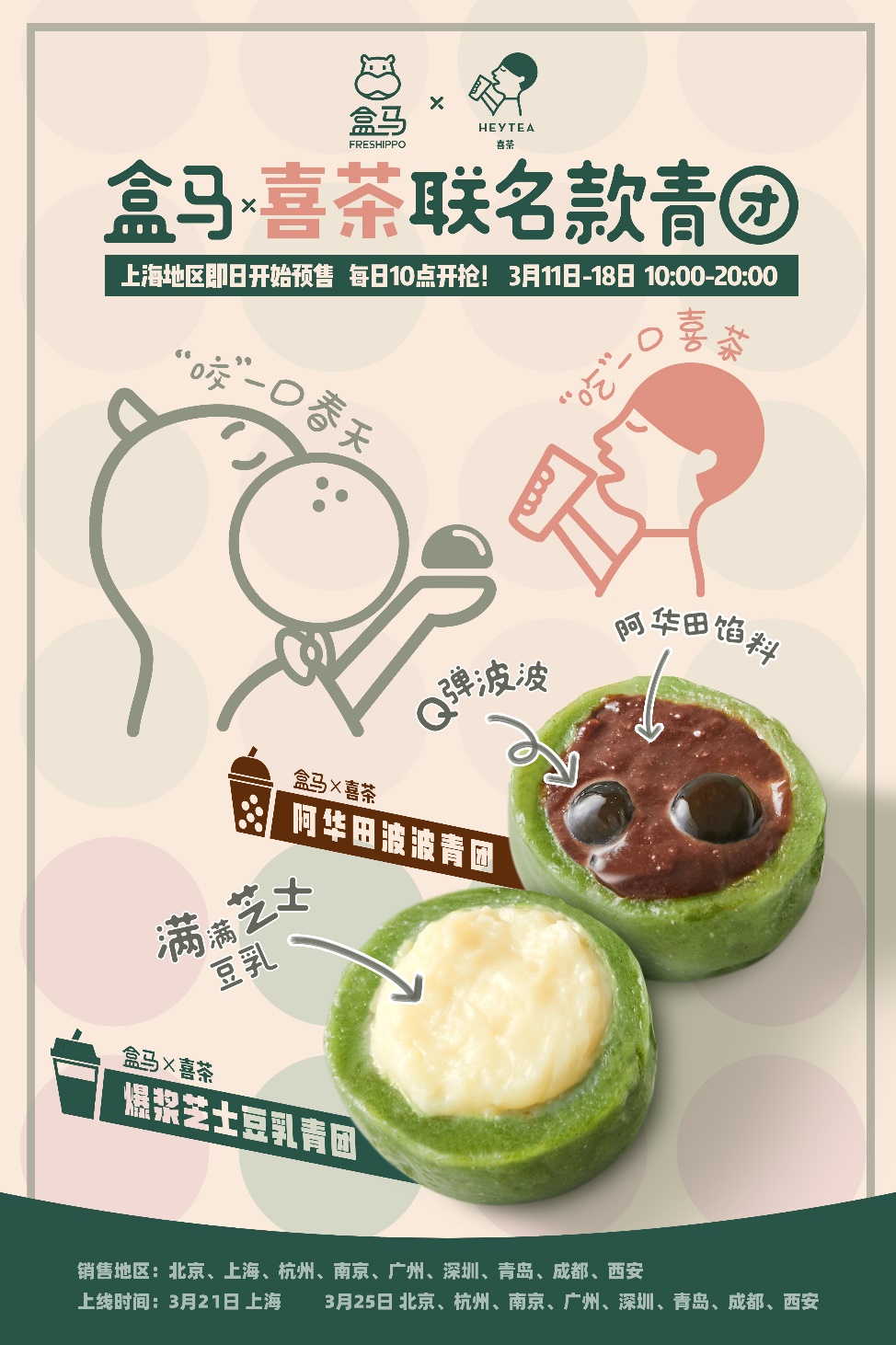據了解,盒馬×喜茶聯名青團于3月11日開啟上海地區的預售,3月21日將正式上線。北京、杭州、南京、廣州、深圳、青島、成都、西安等地將于3月25日上線,屆時消費者可通過盒馬線上下單,30分鐘就能吃上春天的味道。