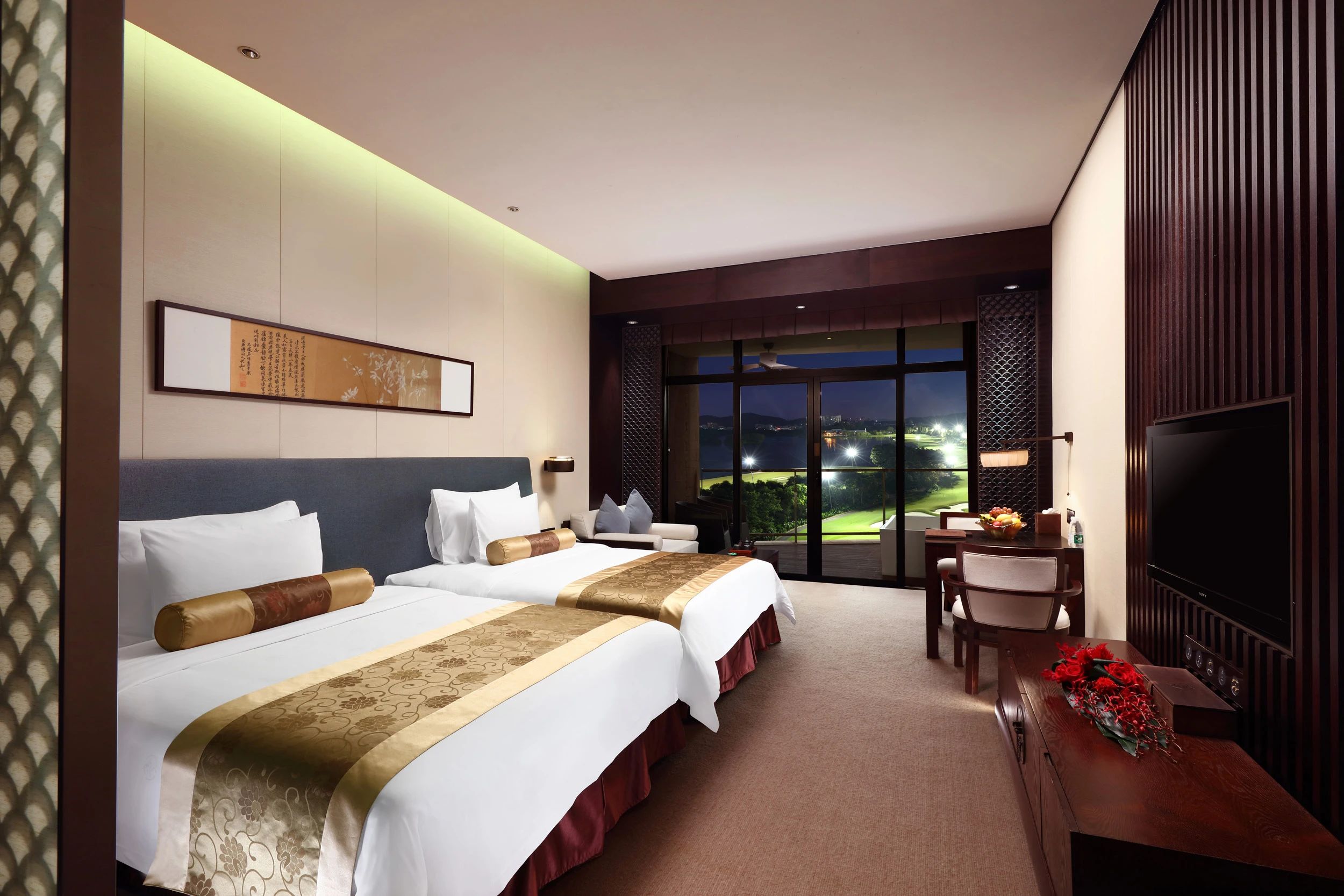 我們這次下榻的是42㎡的豪華客房,以中國風(fēng)為美學(xué)設(shè)計,床頭是韻味十足的古風(fēng)字畫,中式銅鎖、陶瓷擺件……藝術(shù)品無處不在。