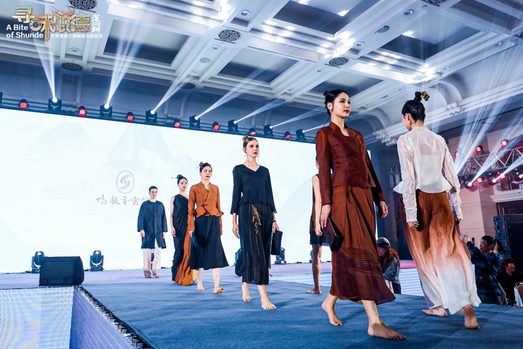 12月18日晚,在深圳華僑城洲際酒店,一段驚艷的順德香云紗模特走秀拉開了世界美食之都順德全國路演的序幕。香云紗是目前世界紡織品中唯一使用純植物染料染色的真絲綢面料,產自順德倫教。作為一項有著600多年歷史的技藝,“香云紗染整技藝”在2008年入選國家級非物質文化遺產,是順德獨特的一張城市名片。當晚的活動上,模特兒們通過主題走秀,展示了各種款式香云紗服裝的魅力。