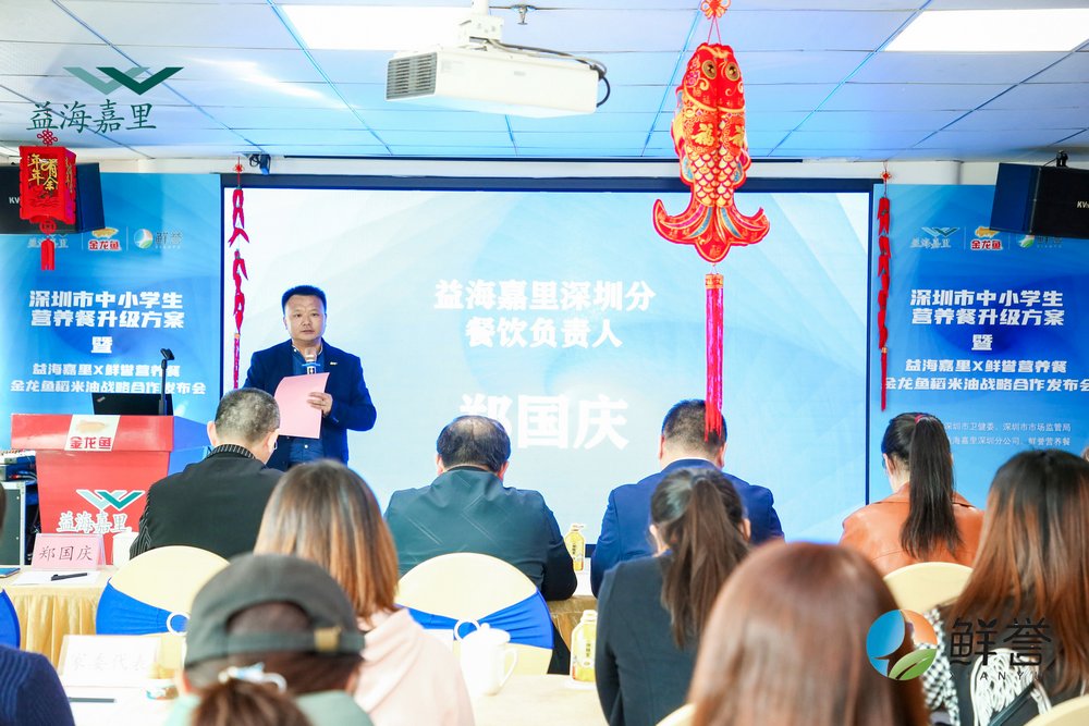 會議開場由益海嘉里深圳分餐飲負責人鄭國慶先生介紹益海嘉里的歷程并對鮮譽營養(yǎng)餐出品表示肯定,隨后鮮譽總經(jīng)理嚴資旺先生敘述了在營養(yǎng)餐升級過程中的努力,通過營養(yǎng)師和專業(yè)博士對營養(yǎng)餐數(shù)據(jù)和內(nèi)容的講述,讓在座的家委代表們更加了解了營養(yǎng)餐升級的必要性和可行性。益海嘉里稻米油項目的張波先生和朱若維女士以視頻的方式講述了金龍魚稻米油的來源以及榮譽,目前金龍魚稻米油已經(jīng)在日本上市多年并作為中小學(xué)生指定用油長期使用。此外,發(fā)布會現(xiàn)場還舉行了益海嘉里與鮮譽戰(zhàn)略合作的授牌及剪彩儀式。