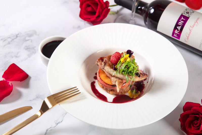 共譜濃情蜜意之夜,怎少得了甜品加乘。酒店餅房行政總廚趙偉以當季時令水果搭配馥郁絲滑的上等巧克力等食材,精心呈獻包括覆盆子蜜桃蛋糕、草莓荔枝蛋糕、咖啡白巧克力櫻桃蛋糕、玫瑰花茶紅酒布丁杯等8款作品。此外,位上菜品新增香煎鵝肝配紅酒焦糖蘋果和藍莓紅酒汁及中式牛奶燉花膠糖水,中西風味相輔相成,都將成就獨特的美味記憶。當天現場將會有小提琴手駐場演奏,妙音悅耳,為甜蜜之夜增添更多柔情。