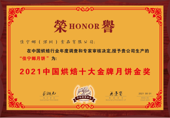 經(jīng)過多年的發(fā)展與沉淀,佳寧娜月餅以先進的工藝、獨特的口味、卓越的信譽贏得消費者的信賴和支持,曾榮獲“深圳老字號”“深圳月餅節(jié)質(zhì)量信譽獎” (連續(xù)12年 )“中國食品安全年會食品安全示范單位”“中國烘焙五仁月餅金獎”“中國烘焙廣式月餅金獎”“中國烘焙潮式月餅金獎”、“中國烘焙十佳名牌月餅”、“中國烘焙老字號月餅“等多項榮譽稱號。