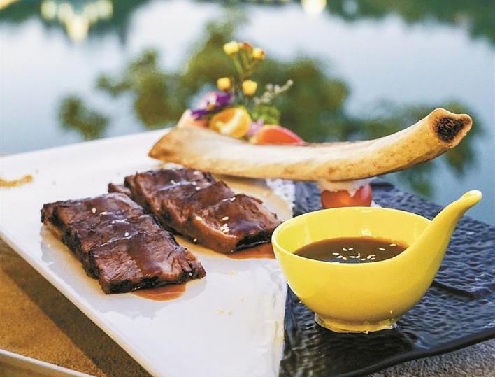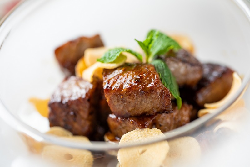 “金蒜一口牛”牛肉切成小方塊,一口就能吃下,櫻桃小嘴也不怕失去儀態。