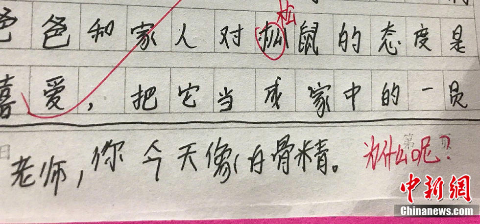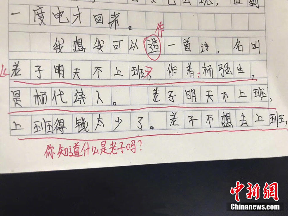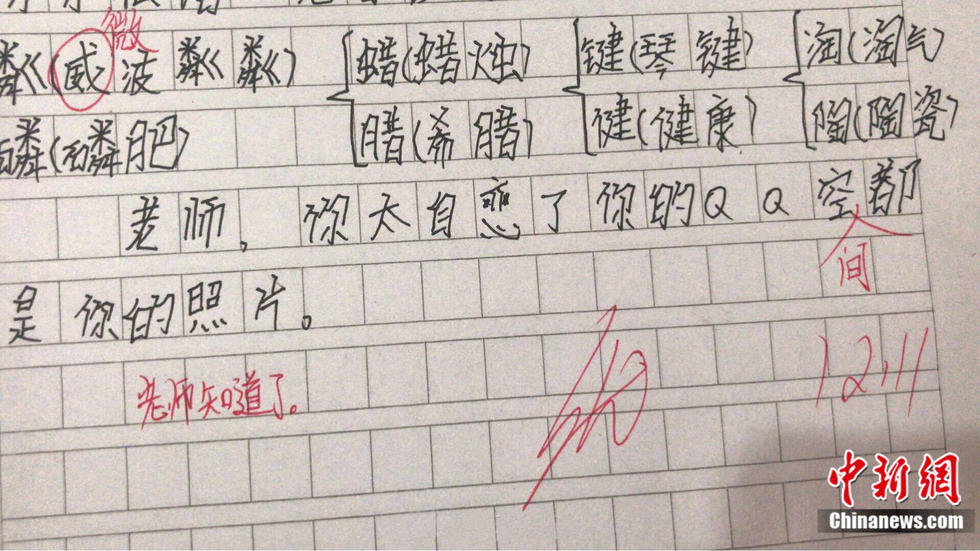 近日,貴州省谷隴翁板小學(xué)的語文老師張沁文,曬出了學(xué)生寫在作業(yè)里的“金句”。“老師,你太自戀了,QQ空間都是自己照片”;“顏值升高才有人喜歡您”……孩子們的童言無忌令人哭笑不得,老師的評(píng)論也很亮眼。