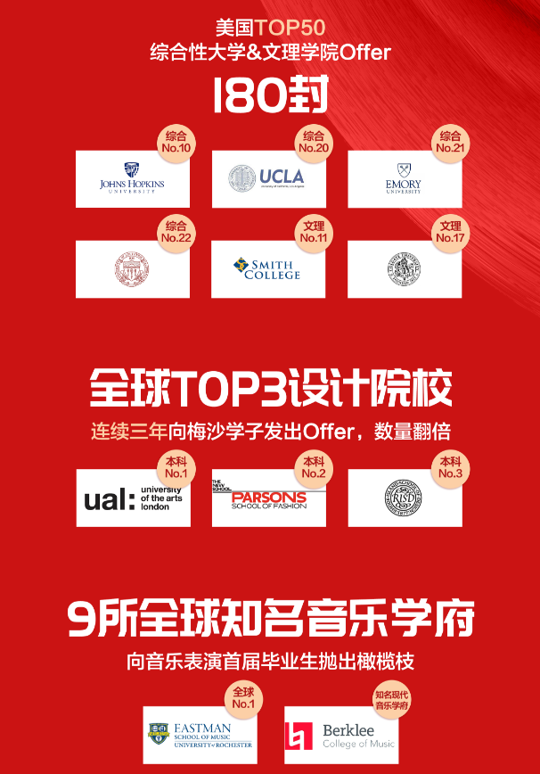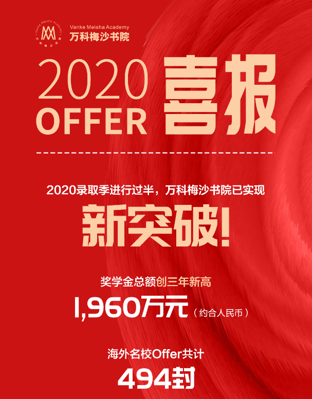 2020申請(qǐng)季還未結(jié)束,梅沙學(xué)子已收獲494封海外名校錄取Offer,獎(jiǎng)學(xué)金累計(jì)約合人民幣1,960萬元,創(chuàng)三年新高。其中,來自美國Top100綜合性大學(xué)及文理學(xué)院的錄取通知書有356份,來自美國Top50綜合性大學(xué)及文理學(xué)院的錄取通知書有180份。
