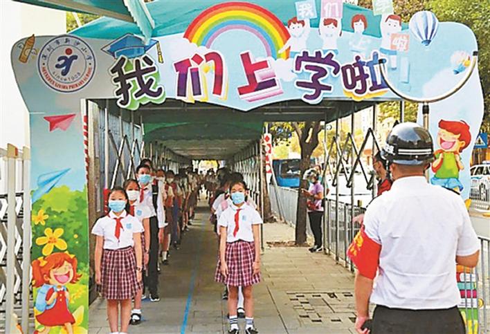 健康副校長和指導(dǎo)員在新沙小學指導(dǎo)防疫工作,引導(dǎo)學生有序入校。