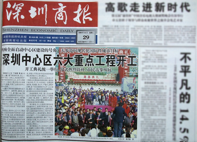 1998年12月29日,深圳商報頭版報道深圳中心區六大重點工程開工