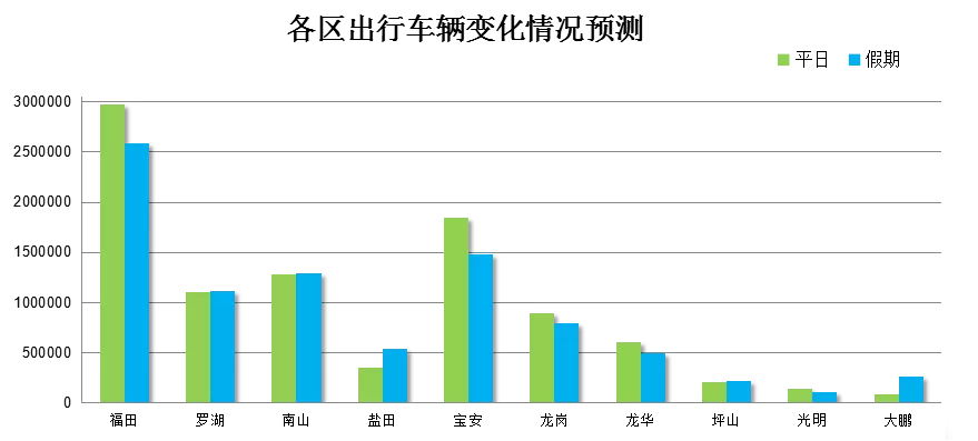 除以上兩個區域外,我市其余各區車輛會較平日有所下降,而原關外的福田、寶安、龍崗,出行車輛數下降較為明顯,整體來看,全市出行車輛數將減少6%。