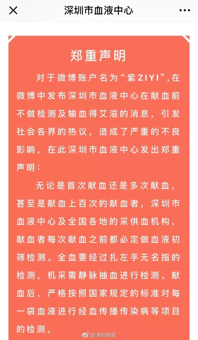@深圳市血液中心發出鄭重聲明:無論是首次獻血者還是多次甚至是上百次的獻血者,每次獻血都必須做初篩檢測,全血要經過扎左手無名指的檢測,機采需靜脈抽血進行檢測。獻血后,嚴格按照國家規定的標準對每一袋血液進行經血傳播傳染病等項目的檢測。