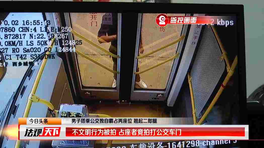 畫面里這位乘客,看起來睡眠質量不錯,上了公交車是倒頭就睡,不過,這姿勢可是很不雅,只見這位乘客獨自霸占了兩個座位,一只腳踩在座位上,另外一只腳還不時得靠在椅背上搖晃著,這一幕,可把同車里的張先生給氣壞了。