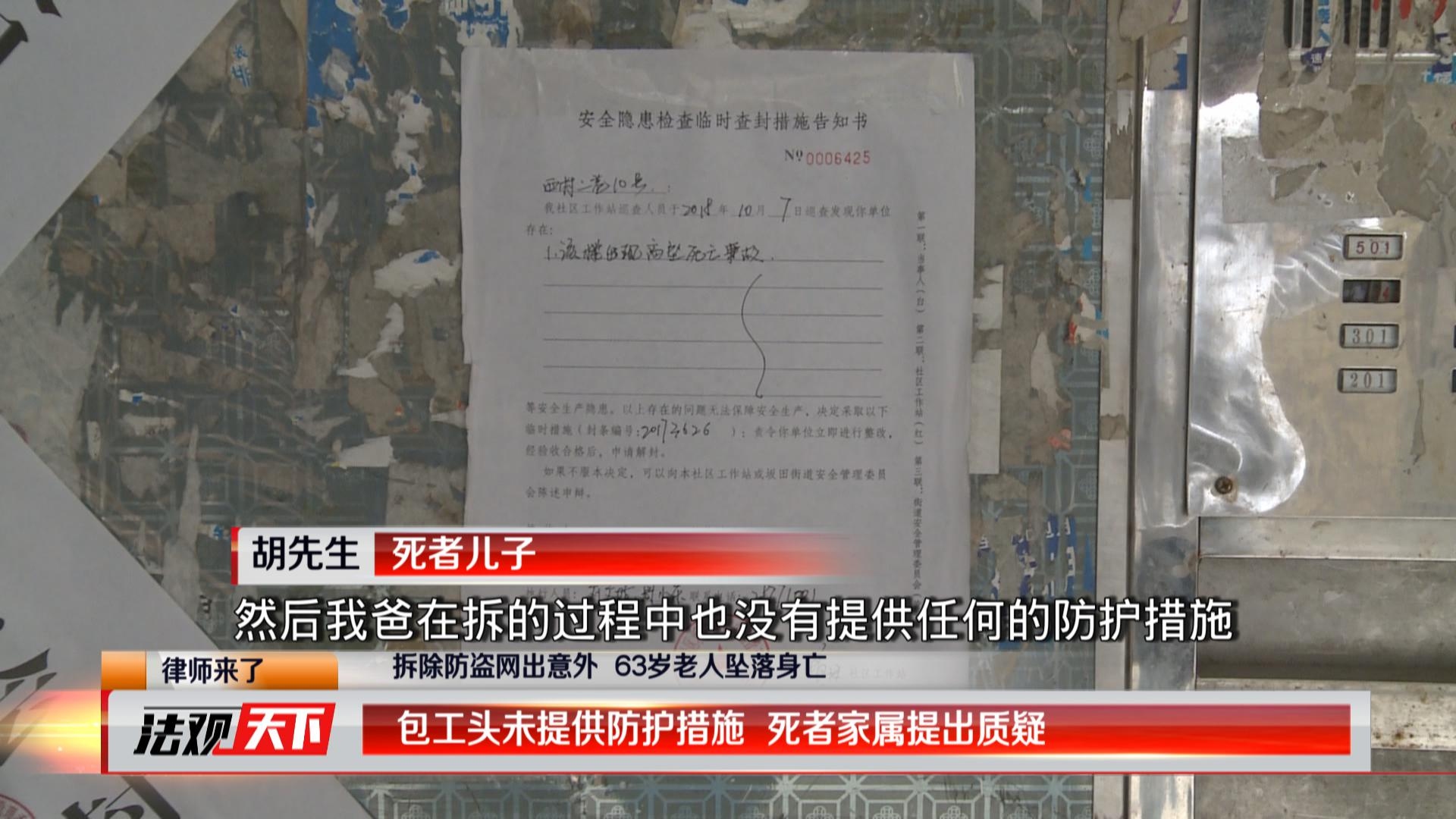 可是在這次事件中,63歲的死者老胡明顯是無證且年齡超標,在高空作業時,也沒有相應的防護措施。死者家屬說,事發后,無論是包工頭還是房東都沒有出面承擔相應的責任。