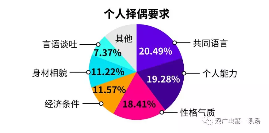 另外,調(diào)查顯示,共同語言、個(gè)人能力、性格氣質(zhì),為單身男女在擇偶時(shí)最看重的三個(gè)方面,其次為經(jīng)濟(jì)條件、身材相貌、言語談吐。