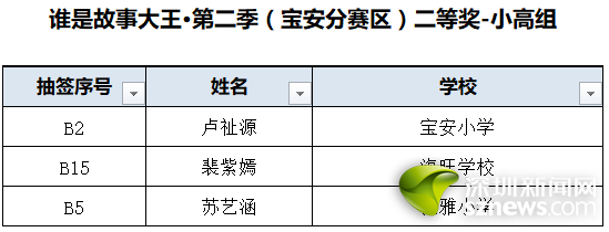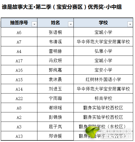 誰是故事大王·第二季(寶安分賽區)獲獎名單: