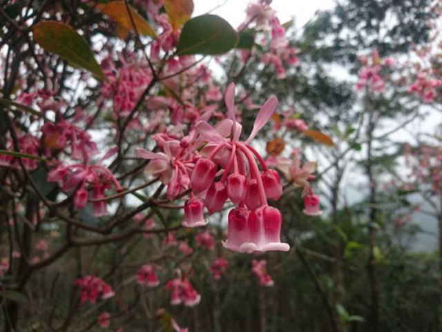 吊鐘花朵朵成束,好似鈴鐺吊掛,花粉紅白色,妖嫩媚人,晶瑩醒目,花期正值元旦、春節(jié),長(zhǎng)期以來(lái)作為吉祥的象征,為嶺南鄉(xiāng)土名花。資料顯示,早在清代中葉,廣東一帶已有將吊鐘作為年花的習(xí)俗。清代屈大均的《廣東新語(yǔ)》記載:"吊鐘花并未折下,能耐久,臘冬多賣于街,土人市以度歲,取其置中不萎也。"吊鐘花紅的稱為"金鐘",白的叫做"銀鐘",朵朵彎垂,似無(wú)數(shù)的小鈴鐺在空中搖曳。古詩(shī)中所詠的"天香新綠一叢叢,金鐘深藏一片紅。風(fēng)吹銀鈴香陣陣,勝過(guò)百花鬧新春"就是對(duì)吊鐘花的生動(dòng)寫(xiě)照。