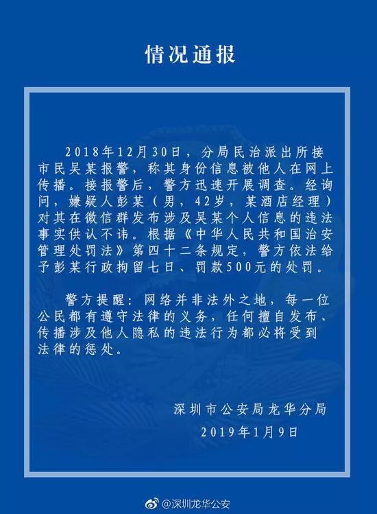 ⑥1月9日,警方發布通報。嫌疑人彭某因在微信群發布涉及吳某(微博 ID:花總丟了金箍棒)的個人信息,被警方行拘七日,罰款500元。