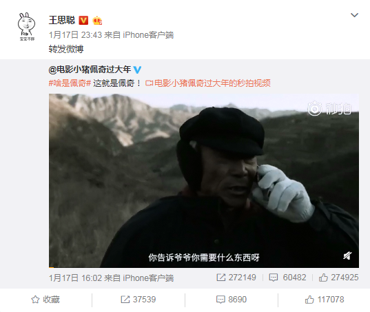 王思聰轉發《啥是佩奇》宣傳片的微博截圖