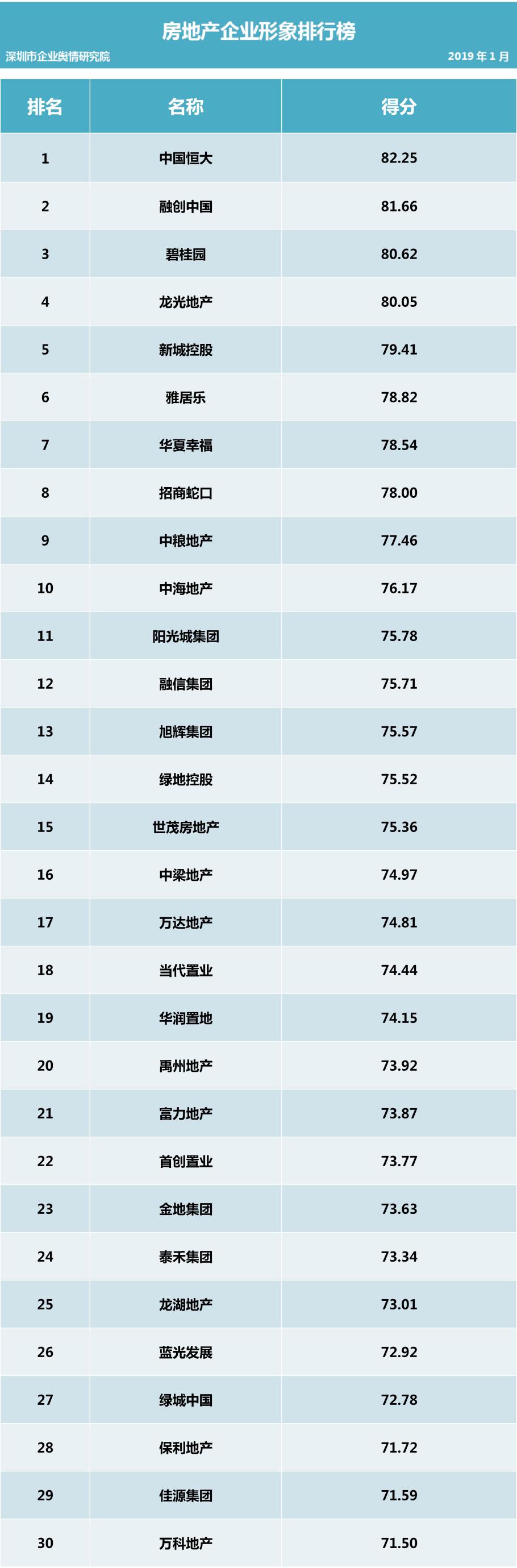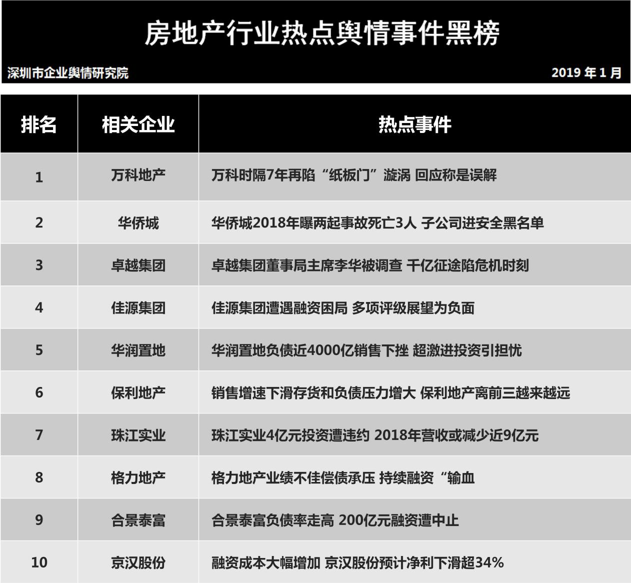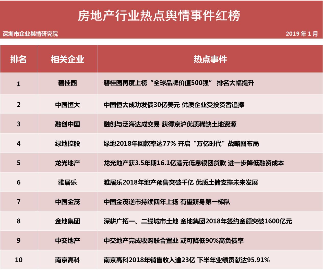 深圳新聞網2019年1月31日訊 (記者田志強 通訊員陳文光)1月31日,深圳企業輿情研究院發布第十二批企業輿情榜單。本次榜單重點聚焦房地產及醫藥保健兩個行業。房地產行業企業輿情榜單由房地產行業熱點輿情事件排行榜(紅、黑榜)及房地產企業公眾形象排行榜組成。