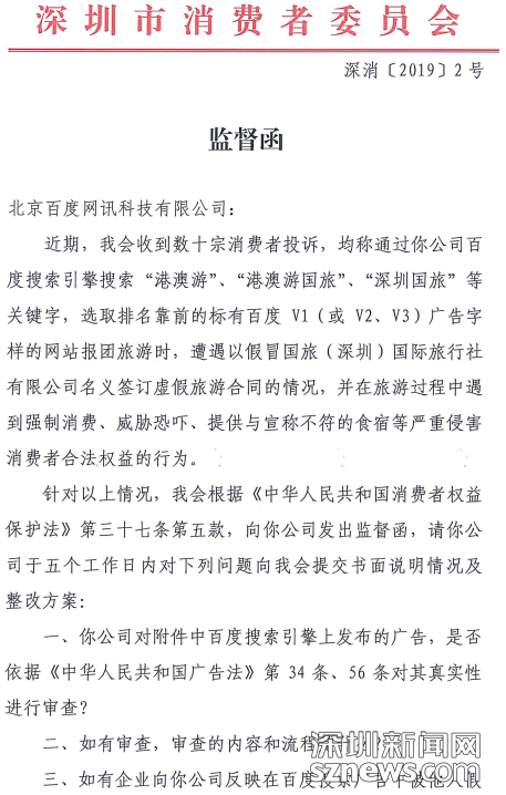 “野馬”旅行社屢禁不絕、愈演愈烈,不僅嚴重傷害了廣大消費者,傷害了合法企業的正當經營,傷害了公平有序的市場競爭秩序,也傷害了深圳的城市形象,這其中,百度難辭其咎。一些不法分子利用百度信譽V認證的核查漏洞和競價排名規則,把百度作為招徠客源的廣告投放平臺,對消費者起到了極強的誤導作用。在此,深圳市消委會“三問百度”: