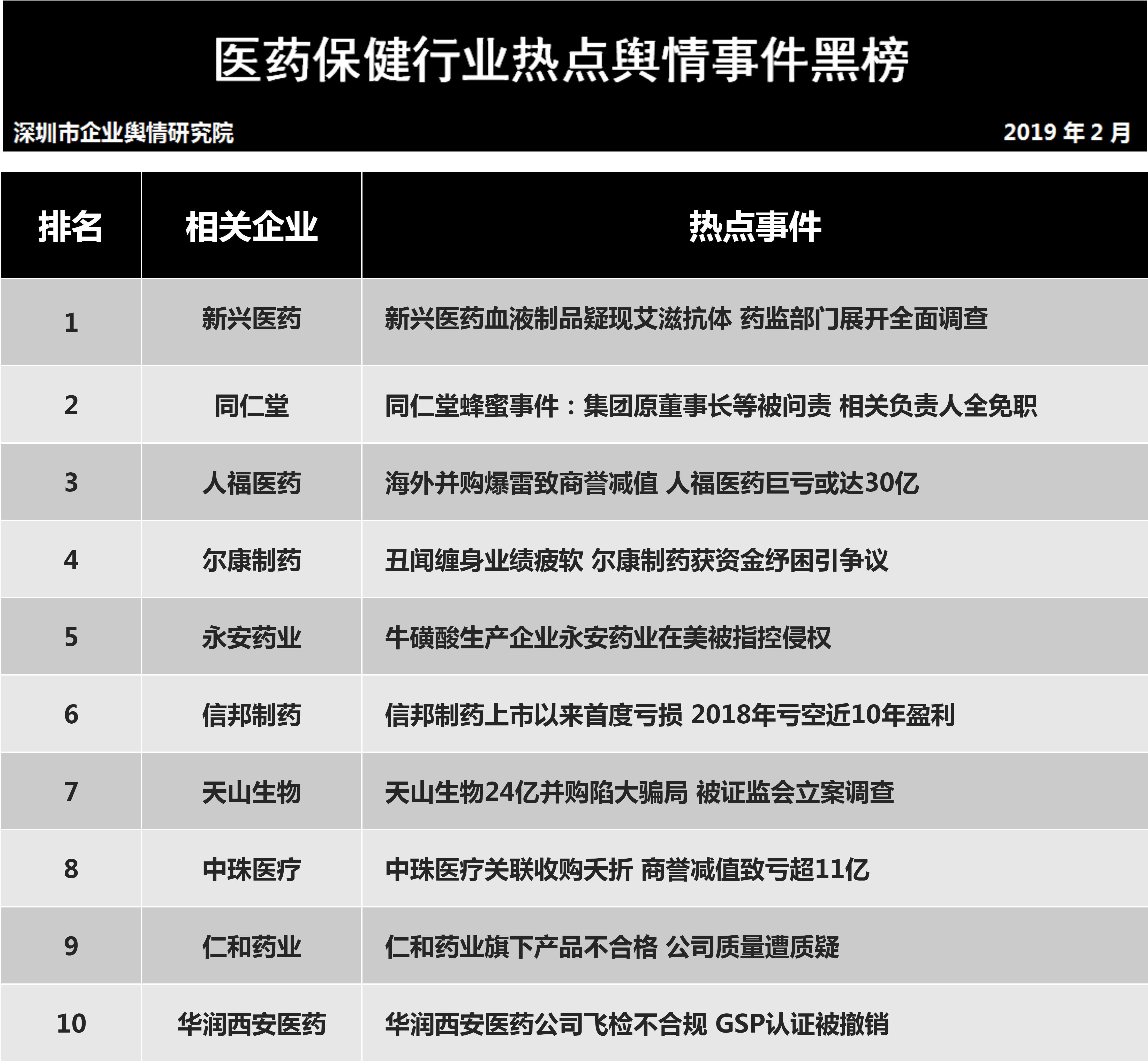 深圳新聞網2019年3月5日訊 (記者田志強 通訊員陳文光)3月5日,深圳企業輿情研究院發布第十三批企業輿情榜單。本次榜單重點聚焦房地產及醫藥保健兩個行業。醫藥保健行業輿情榜單由醫療保健行業熱點輿情事件排行榜(紅、黑榜)及醫藥保健行業企業公眾形象排行榜組成。