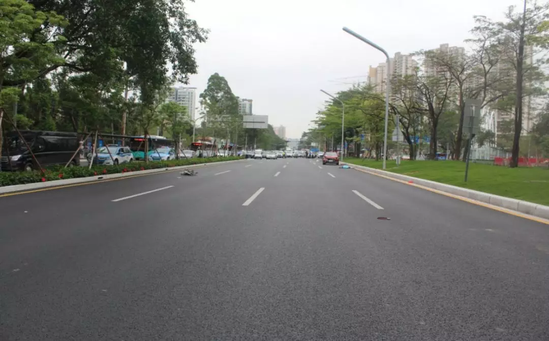 案發現場位于寶安區寶安大道新安街道中糧卡羅社區路段,南往北主道路寬13.72米,該路段設立有輔道及非機動車道。瀝青路面,照明條件為白天,交通信號方式為標志、標線。