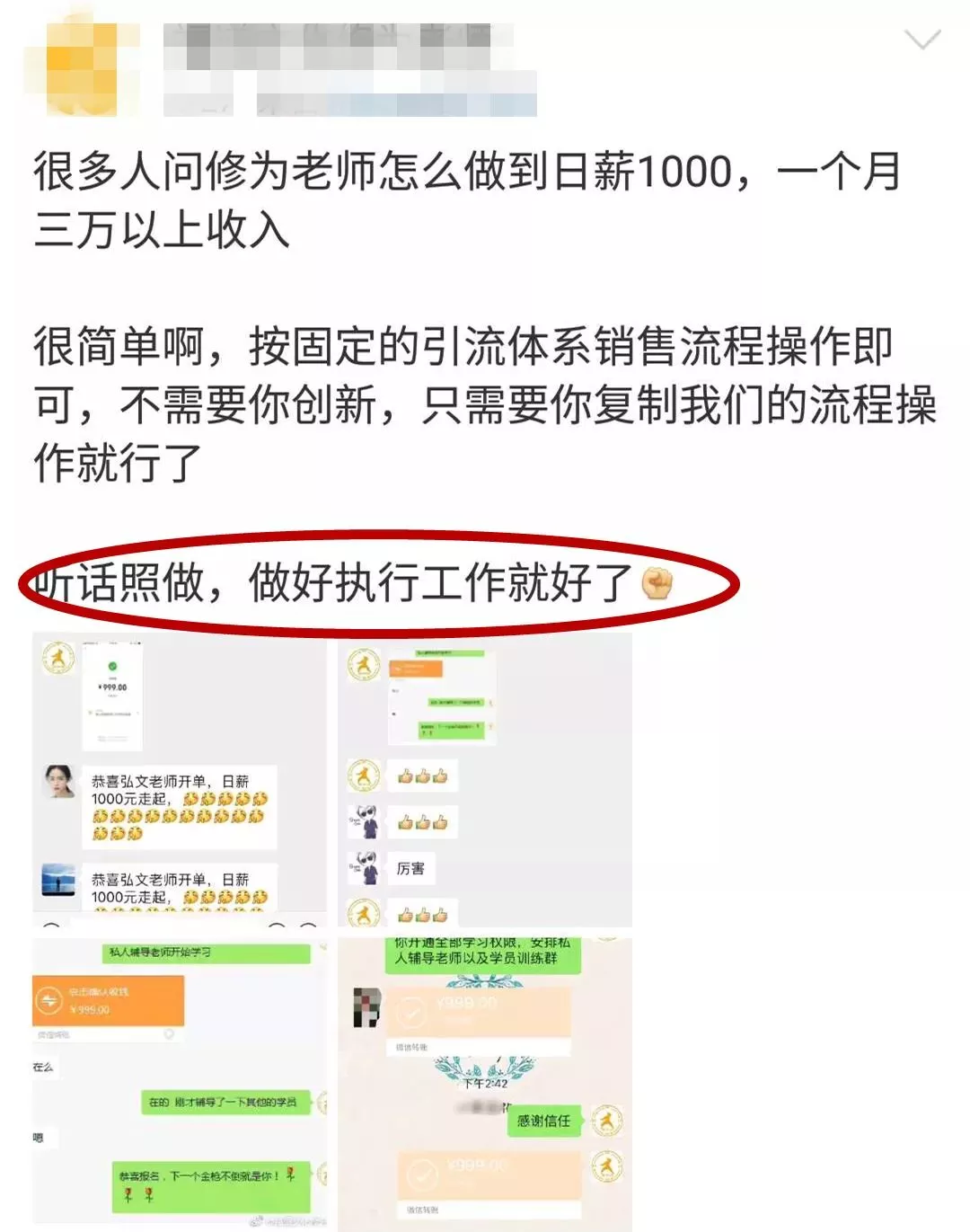 福道文化傳播有限公司從“服務老師”到“學員”,大多都是初中以下文化水平。一旦有新人繳納會費,該團伙成員立刻將受害人拉入“會員群”。在各“會員群”內,群內其他人努力活躍氣氛,分享連某整理的“生財之道”,只為讓新人再繳納5000至10萬元不等的費用。