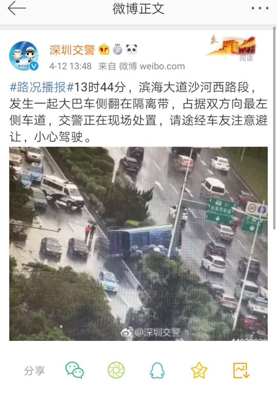 深圳交警通過微博發布消息,提醒沿途司機注意避讓,小心行駛。