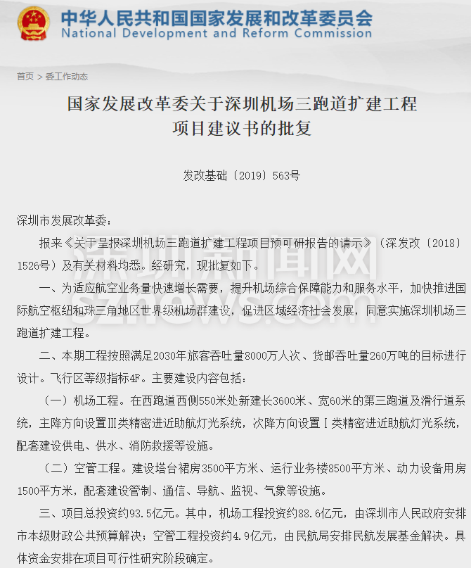 國家發展改革委關于深圳機場三跑道擴建工程項目建議書的批復截圖