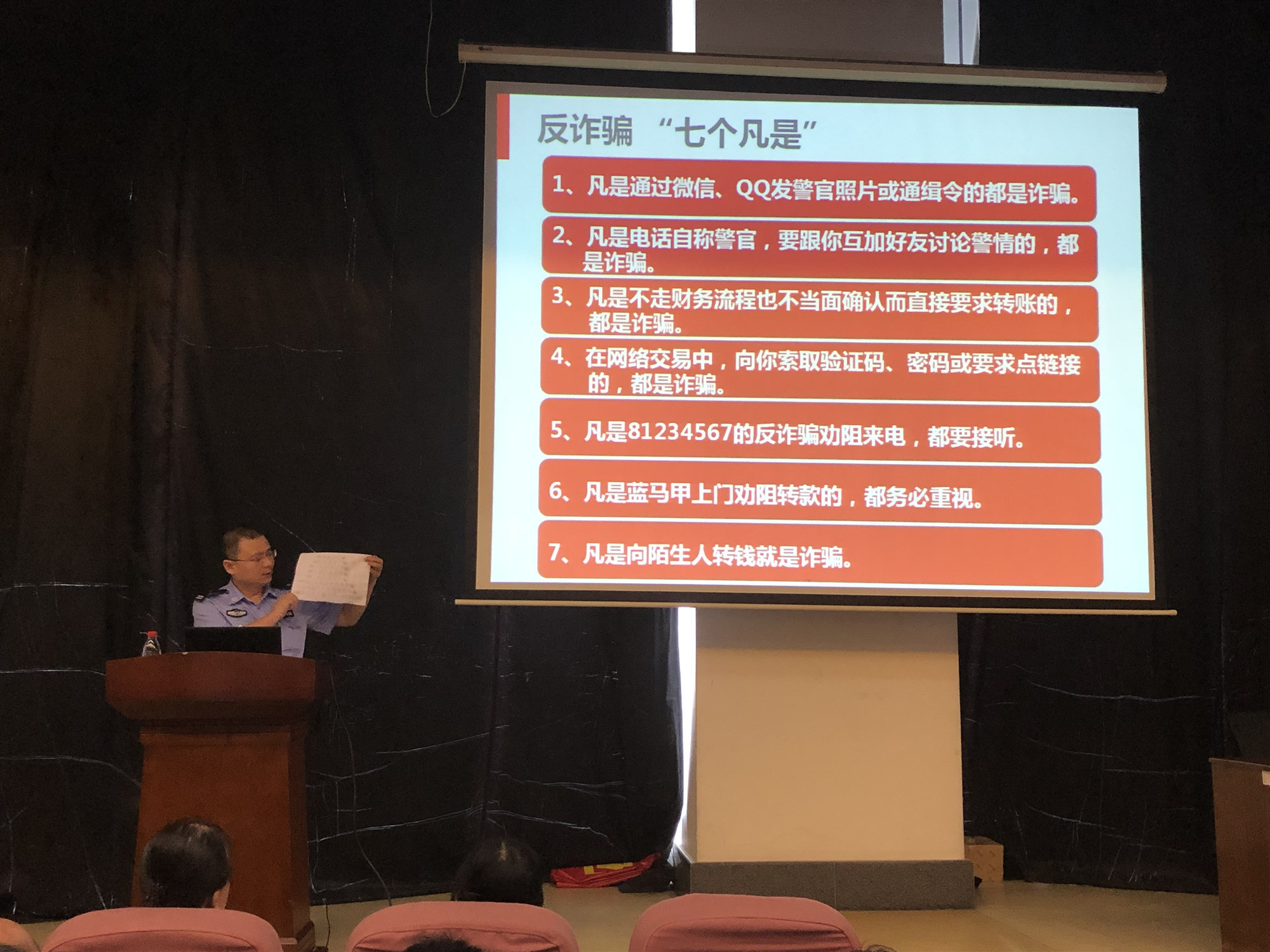 4月12日下午,惠杰副所長(zhǎng)、社區(qū)民警黃旭波、孫立波在財(cái)富廣場(chǎng)小禮堂開展香蜜湖“反詐騙課堂”第一場(chǎng),向財(cái)富廣場(chǎng)各公司負(fù)責(zé)人、財(cái)務(wù)人員開展反詐騙宣傳,“反詐騙宣傳”PPT包含反詐騙工作面臨的嚴(yán)峻形式、電信詐騙的常見手段、各類案例及宣傳視頻、電信詐騙的防范要點(diǎn)、以及社區(qū)民警的微信二維碼名片等等。此次宣傳借用大廈的會(huì)議室、物業(yè)單位的小禮堂,將本樓的商戶、公司集中在一起,形成區(qū)域效應(yīng);突出重點(diǎn)人員,主要針對(duì)單位負(fù)責(zé)人、財(cái)務(wù)人員,切實(shí)提高居民自我防范意識(shí)。