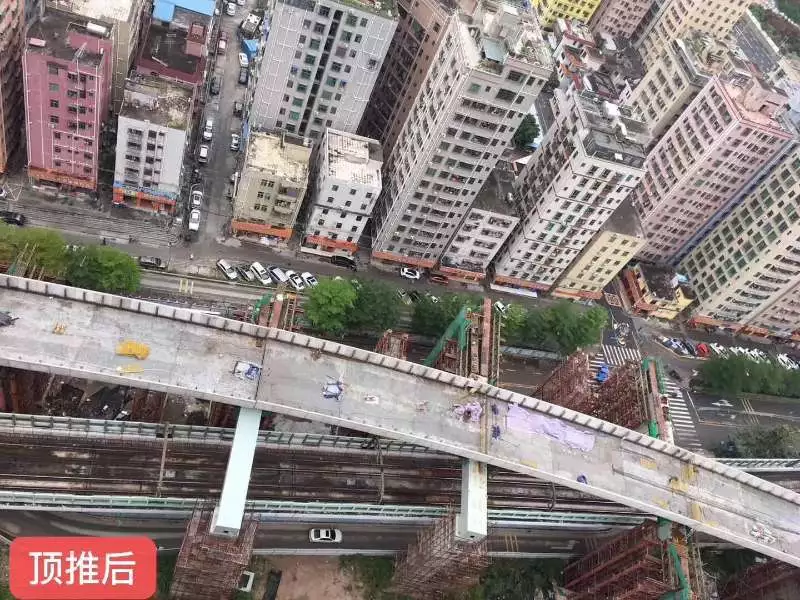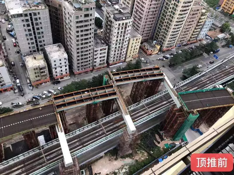 深圳地鐵6號線一期的紅山站至上塘北站區間由中鐵建大橋局承建,上跨正在運營的地鐵4號線,兩條線最近處僅相隔1.2米。本次頂推高架為4孔30米雙線簡支鋼混結合梁,采用依次整體橫向頂推的方式,單孔梁重430噸,最大頂推距離17米,斜跨段平曲線半徑為450米,交叉角達30度。第一孔簡支鋼混結合梁于3月3日開始頂推,歷時22天,最后一孔于25日完美收工。