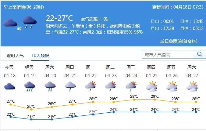 深圳新聞網2019年4月18日訊 今日天氣:陰天間多云,午后轉(雷)陣雨,夜間降雨趨于頻密;氣溫22-27℃