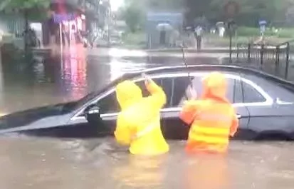 視頻中,一名外賣小哥和一名環衛工正在砸車窗,此時車已經淹沒在水中,快漫上車窗。記者了解到,該視頻發生在上周末,深圳暴雨中一名開著奔馳車的司機被困路上,已經出現缺氧情況,幸得路過的外賣小哥出手救人。