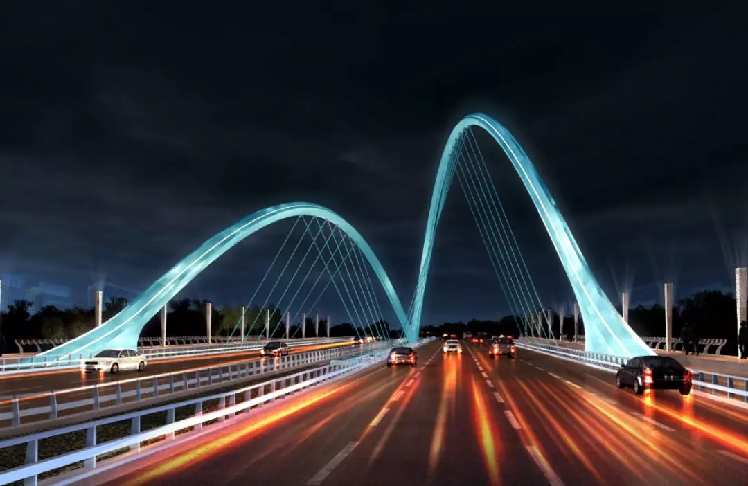 橋梁結構形式采用下承式拱橋,兩幅高低拱空間交叉,形態優美。橋梁周邊環境較為舒朗,橋梁設計體現豎向視覺沖擊力,體現地標性,使橋梁具有支配環境和成為景觀主題因素。