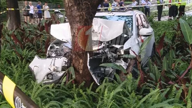 據現場目擊者稱當時車輛直接碾過人行綠道并撞飛了兩個小孩,最終車頭撞向荷花塘邊的一棵大樹才停住,如果不是這棵大樹阻擋,這輛車很有可能會沖向荷花塘里。