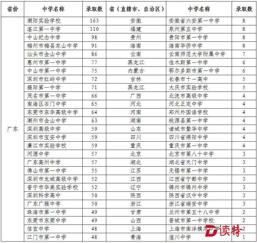 絕大部分考生來自全國知名重點(diǎn)中學(xué)。其中廣東的潮陽實(shí)驗學(xué)校錄取人數(shù)最多,達(dá)到163人;湛江第一中學(xué)錄取110人;中山紀(jì)念中學(xué)錄取98人。深圳錄取人數(shù)最多的是紅嶺中學(xué),錄取72人。