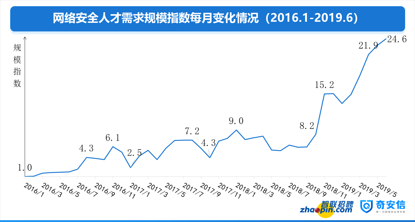 根據智聯招聘網絡安全人才大數據顯示,2019年6月網絡安全人才市場需求的規模達到2016年1月需求的24.6倍,相比2018年7月也增長了3倍,增長速度堪稱驚人!