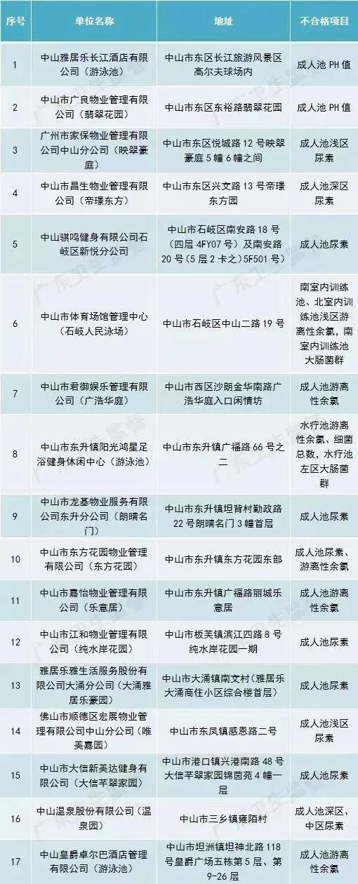 廣東省部分城市游泳場所水質抽檢不合格場所名單(第一批)