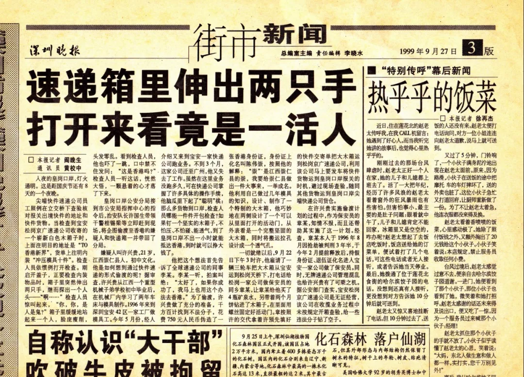 而歷史賦予這支鐵軍的特殊使命任務則是重拳打擊口岸走私和偷渡犯罪。皇崗口岸派出所老職工桂錫梁至今還珍藏著一份些許泛黃的舊報紙,一篇名為“速遞箱里伸出兩只手,打開來看竟是一活人”的報道記錄了1999年9月22日曾發生的一起偷渡案件。作為當時參與處置的一員,桂錫梁回憶道,犯罪分子將自己裝進一個特制的大木箱中,偽裝成裝有“沖壓模具”發往香港的快遞箱,計劃偷渡出境,最終在位于皇崗口岸附近的快遞轉運點被警方查獲。