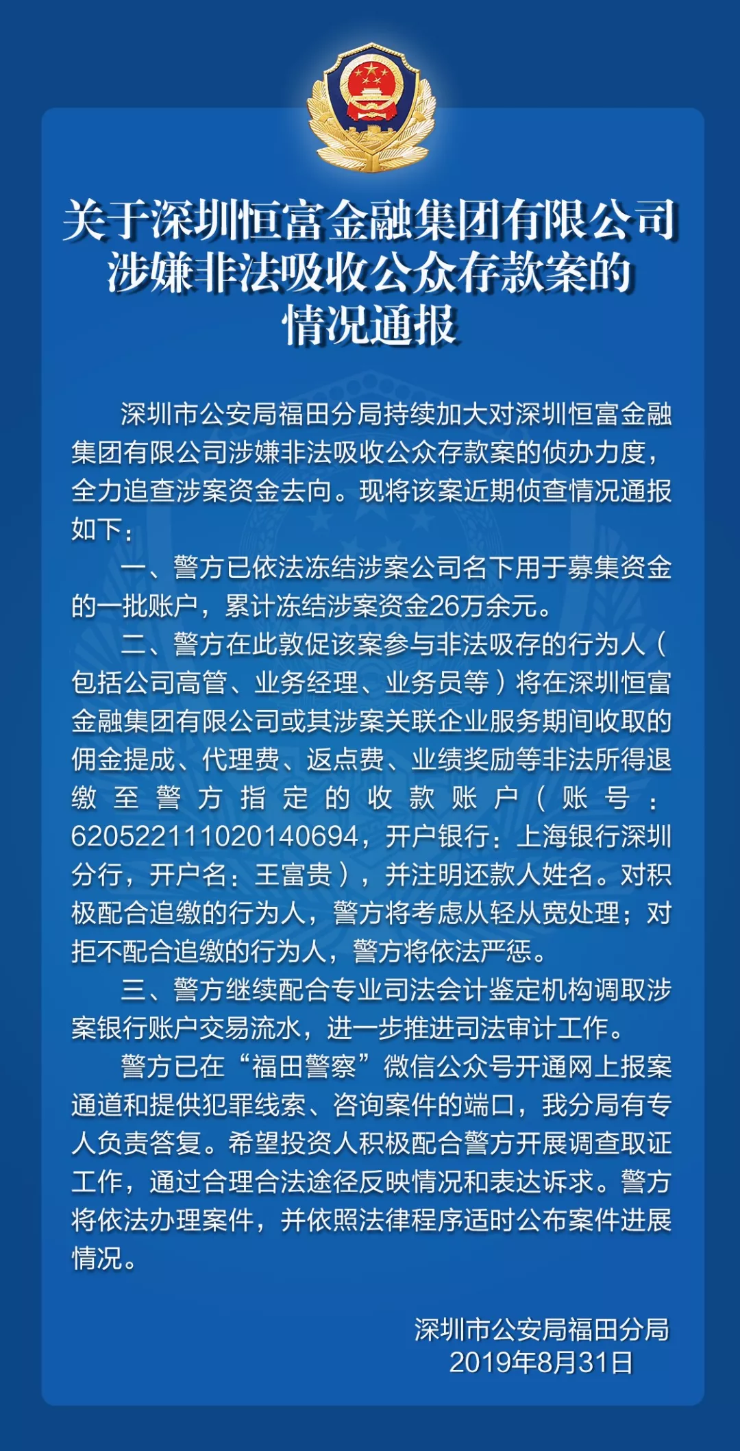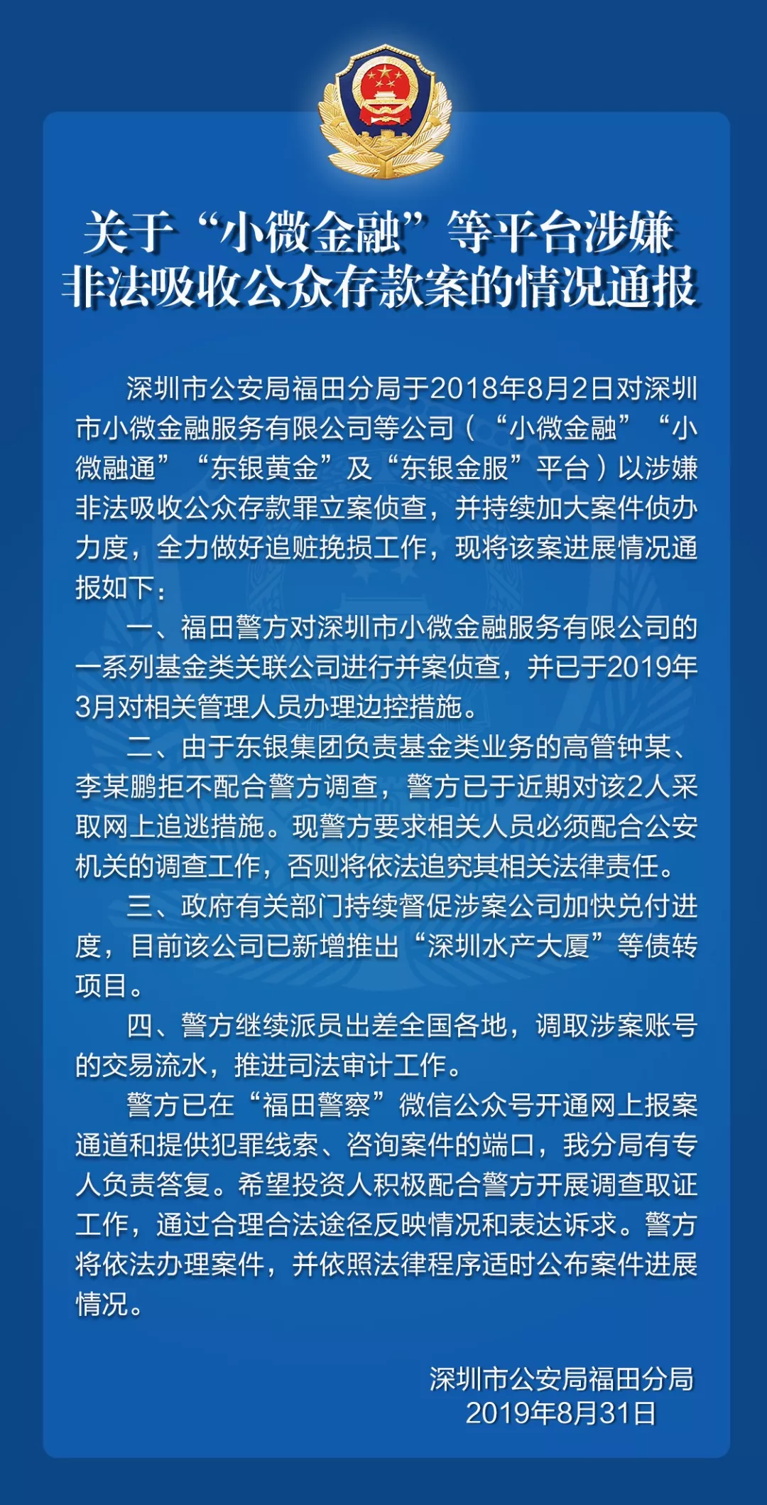 關于深圳恒富金融集團、“小微金融”等平臺的案情通報