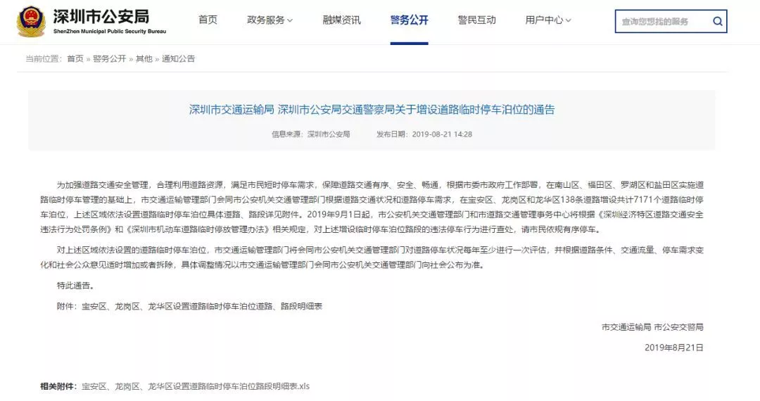 據悉,2019年9月1日起,市公安機關交通管理部門和市道路交通管理事務中心將根據《深圳經濟特區道路交通安全違法行為處罰條例》和《深圳市機動車道路臨時停放管理辦法》相關規定,對上述增設臨時停車泊位路段的違法停車行為進行查處,請市民依規有序停車。