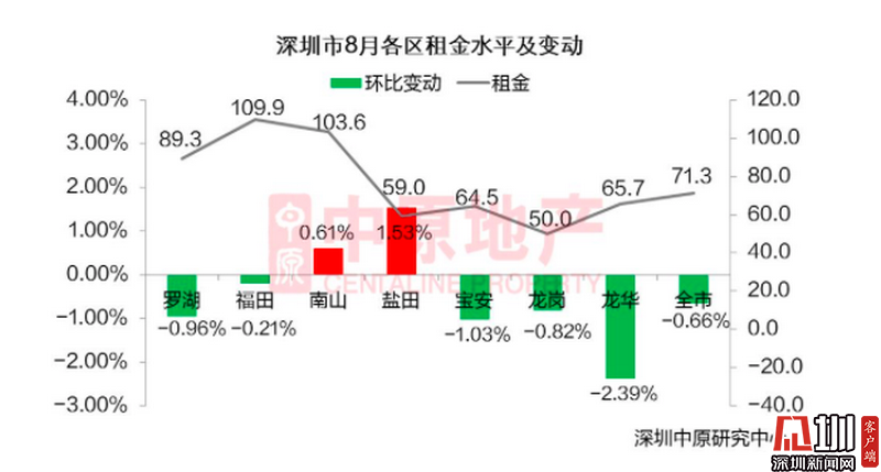 值得注意的是,租賃市場也出現小幅下滑。根據深圳中原研究中心監測顯示,租金方面8月全市住宅租金71.3元/㎡·月,環比下滑0.66%。從租金水平看,福田租金水平全市最高,為109.9元/㎡·月;南山租金緊隨其后,達到103.6元/㎡·月。從各區租金變化幅度來看,僅鹽田和南山租金上漲,其余五區租金都出現下調。其中,鹽田區漲幅1.53%,漲幅最大;而龍華區環比下滑2.39%,下滑最為明顯。