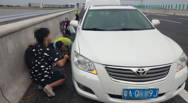 10月5日下午4點多,珠海交警郭警官開著警車在珠三角環線高速巡邏時,看到有一輛粵AQ××9J號白色豐田小車停靠在應急車道上,打著雙閃。郭警官立即上前詢問情況,原來小車剛上高速沒多久就爆胎了,司機深知在高速停下來很危險,急得團團轉,天還下起了小雨。