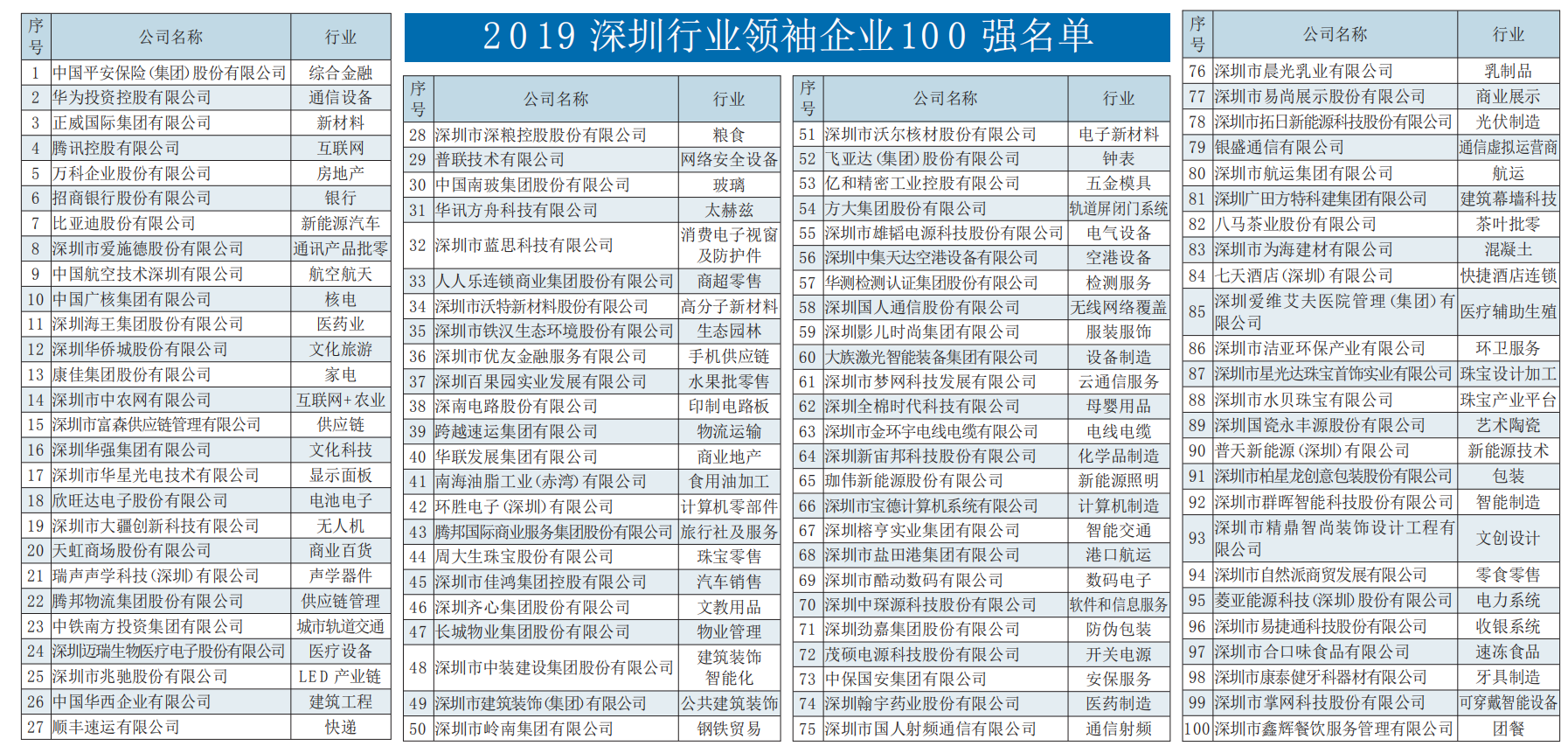 平安、華為、正威居前三 “深圳行業領袖企業100強”榜單發布