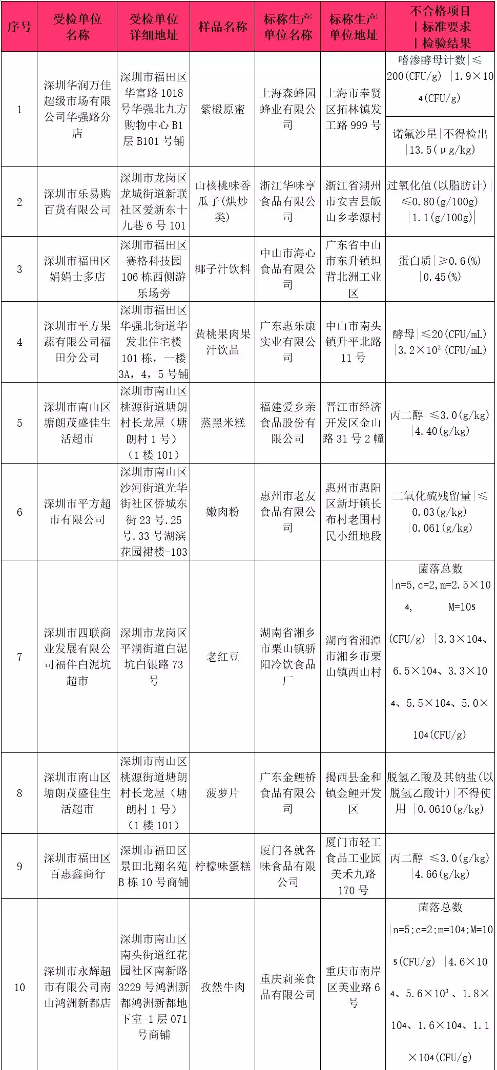 本次共抽檢流通環(huán)節(jié)食品918批次,涉及流通環(huán)節(jié)經(jīng)營(yíng)主體230家次,共檢測(cè)食品指標(biāo)5434項(xiàng)次。其中檢出不合格樣品10批次,涉及不合格食品類別有炒貨食品及堅(jiān)果制品1批次,淀粉及淀粉制品1批次,蜂產(chǎn)品1批次,糕點(diǎn)2批次,冷凍飲品1批次,肉制品1批次,水果制品1批次,飲料2批次;涉及不合格項(xiàng)目類別為獸藥殘留、品質(zhì)指標(biāo)、微生物污染、食品添加劑。