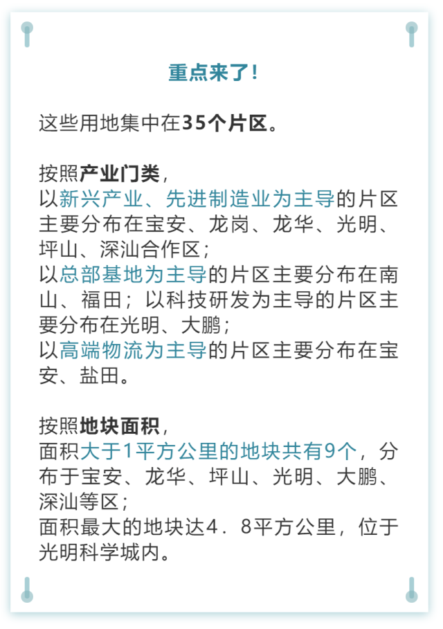 根據梳理,此次可供應產業用地共35塊,總面積超過30平方公里。其中深圳市域范圍內可供應產業用地約25平方公里,深汕合作區可供應產業用地約5平方公里,未來凡是符合深圳產業導向,符合高質量發展要求的企業和項目都將得到充足的空間保障。