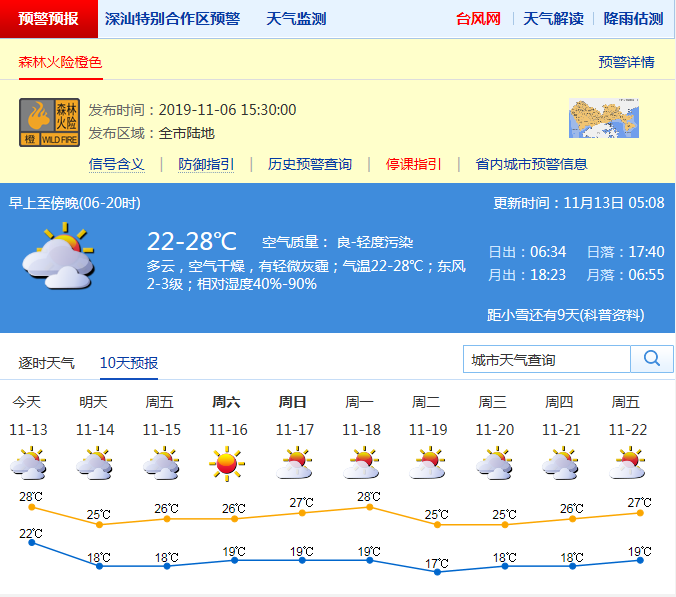 但,據深圳市氣象局消息,13日多云,早晚清涼,氣溫21-28℃,部分時段有輕微灰霾。13日夜間-14日受冷空氣影響,氣溫下降2-3℃,北風加大,沿海、高地和海區最大陣風7級左右。15-17日晴天干燥,風力減弱。18日-19日受新一股冷空氣影響,北風再次加大,氣溫明顯下降,深圳有望入秋。