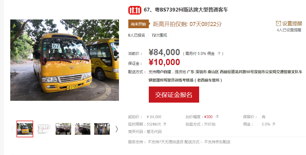 競買人應于拍賣會前在京東拍賣平臺進行實名登記注冊,注冊成功后請按京東拍賣平臺的提示進行操作;競買人在對拍賣標的物首次確認出價競拍前,按系統提示報名繳納10000元/輛的保證金;在競價過程中,請競買人按規定的加價幅度300元出價,若自行出價,請仔細核對好出價金額,若出現出價金額錯誤的情況,由買受人自行承擔后果;拍賣成交后,買受人請于拍賣成交之時起72小時內全額支付拍賣成交價款、拍賣傭金、增值稅及附加、機動車轉移登記車牌費,并到廣東華士德(深圳)拍賣行有限公司所在地(深圳市羅湖區中興路219號華興酒店4樓)簽署《拍賣成交確認書》及辦理相關手續。