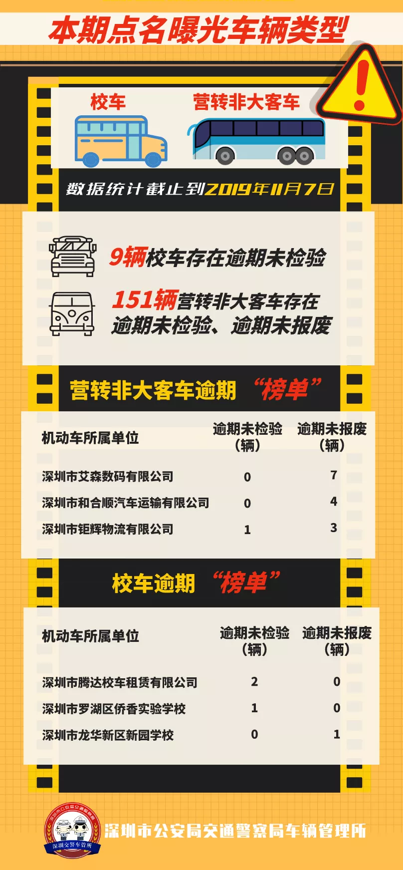 見圳客戶端·深圳新聞網(wǎng)2019年11月14日訊 據(jù)“深圳交警權威發(fā)布”微信公眾號消息,部分企業(yè)、駕駛?cè)撕鲆暟踩珕栴},對名下“逾期車輛”遲遲不處理,存在著重大安全隱患。深圳交警繼續(xù)針對重點隱患車輛點名曝光,數(shù)據(jù)統(tǒng)計截止到2019年11月7日,9輛校車存在逾期未檢驗,151輛營轉(zhuǎn)非大客車存在逾期未檢驗、逾期未報廢。