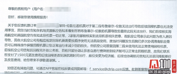 近日,葉先生向深圳新聞網記者爆料稱,他于今年8月份通過攜程網購買國慶期間深圳往返倫敦的機票,但轉機時卻因查不到登機信息導致滯留機場,又因航司規定被剝奪返程機票的使用權。事后,葉先生反復與平臺及航司溝通要求說明事件原因并要求賠償,但目前事件尚未完全解決。