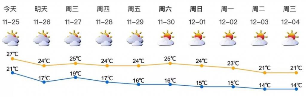 11月26日受冷空氣影響,氣溫下降,早晨最低氣溫降至16-17 ℃,沿海、高地和海區最大陣風6級左右;