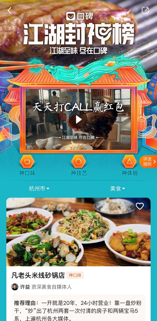 今年“雙12”,口碑餓了么首次發布“江湖封神榜”,入圍店鋪先由美食體驗者、觀察家、媒體團在內的本地評審團先提名,再經過阿里本地生活大數據進行智能評分,同時邀請眾多消費者投票驗名“真身“。商戶上榜不靠流量,不用刷單,也不必擔心惡意差評影響流量和排名。消費者就算沒有本地老餮帶路,參考“江湖封神榜”就能找到地道美食。目前,首批入選的1730家店鋪,分布在北京、杭州、成都、廣州等13座城市。消費者通過口碑app上選擇相應的城市坐標,點擊“江湖封神榜”,就可以找到推薦好店。